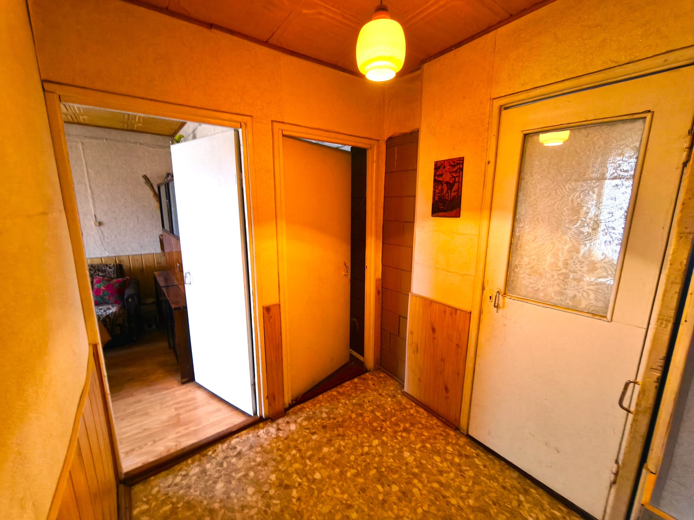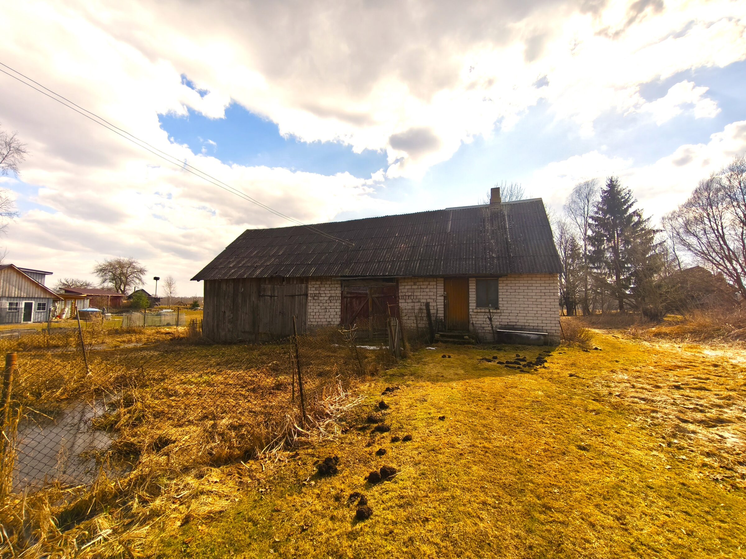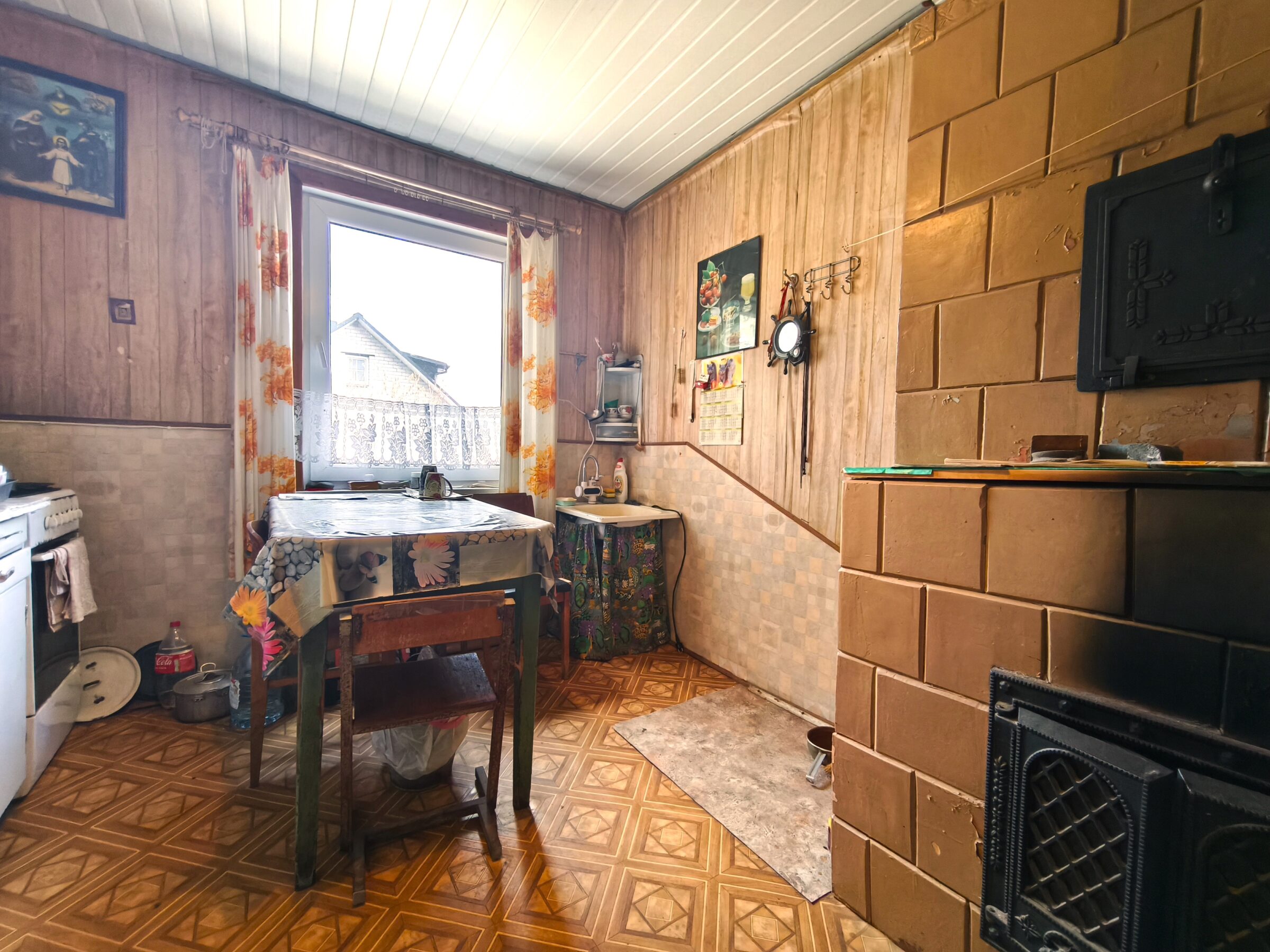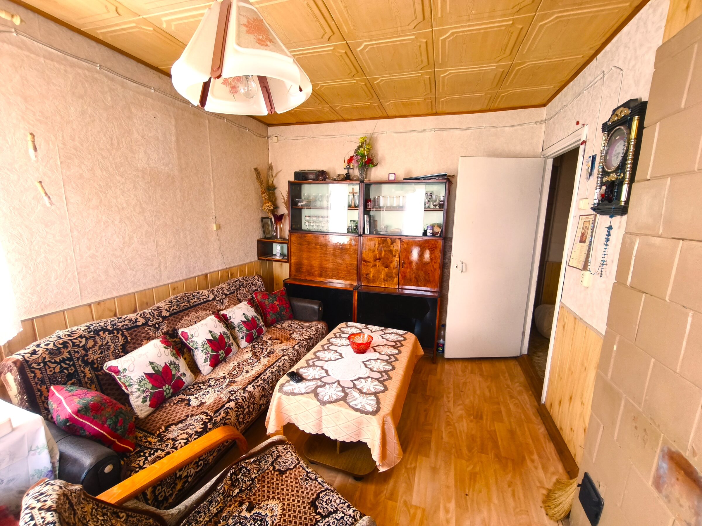 – Vieno aukšto rąstinis apmūrytas namas 60kv.m.(3 kambariai, virtuvė, koridorius, du sandėliukai);
